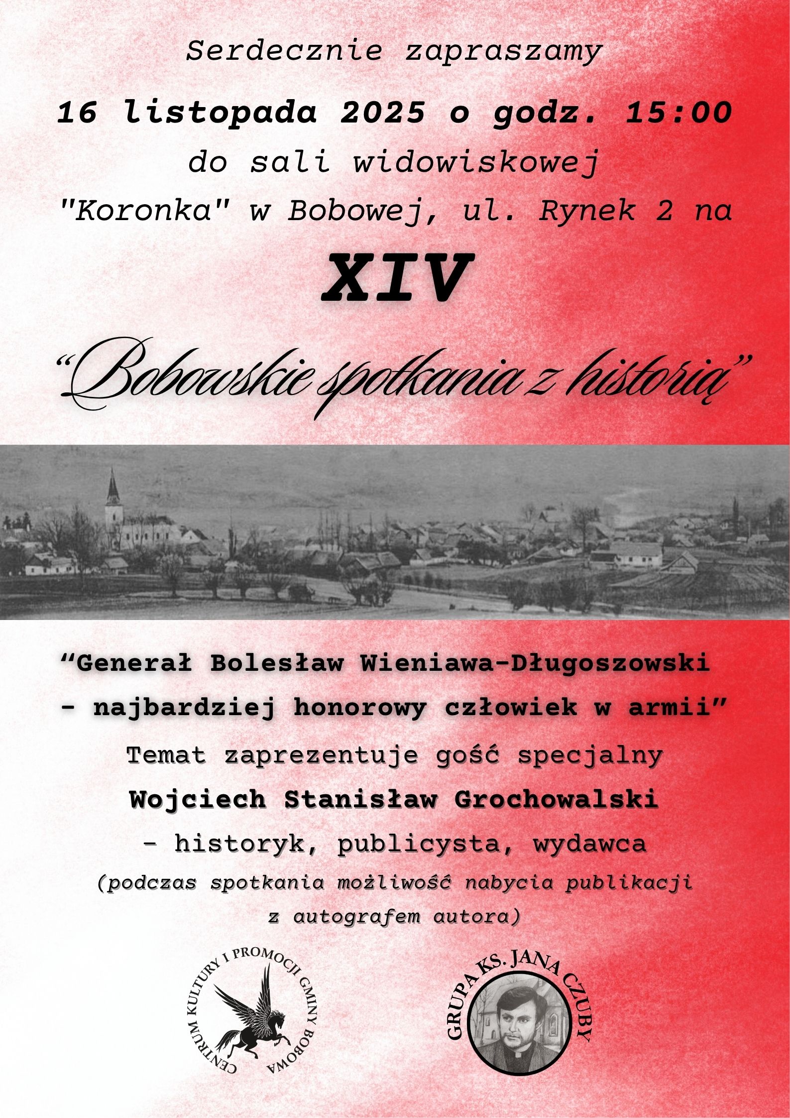 XIV Bobowskie spotkania z historią będą przebiegać pod hasłem „Generał Bolesław Wieniawa-Długoszowski – najbardziej honorowy człowiek w armii”. W roli mówcy wystąpi gość specjalny: Wojciech Stanisław Grochowalski. Jest historykiem, publicystą i wydawcą.