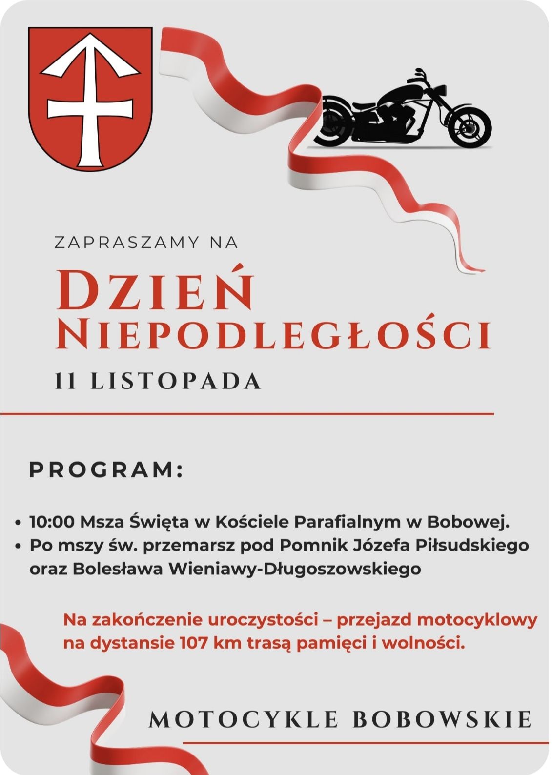 Godnie uczcijmy to dziejowe wydarzenie! Ale to nie wszystko – Bobowska Grupa Motocyklowa organizuje uroczysty przejazd na dystansie 107 kilometrów trasą pamięci i wolności.