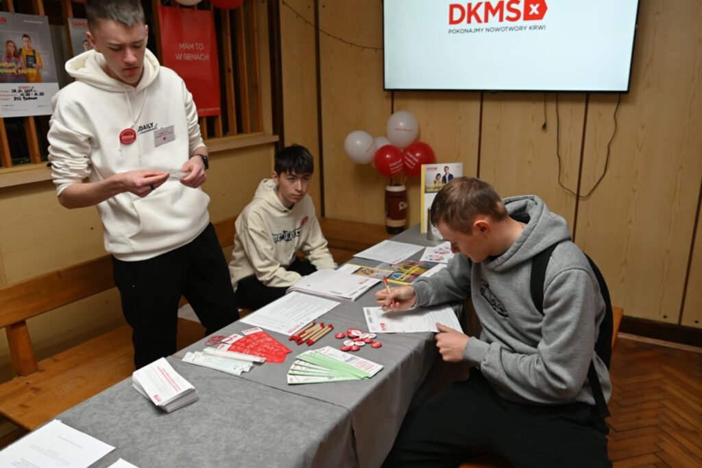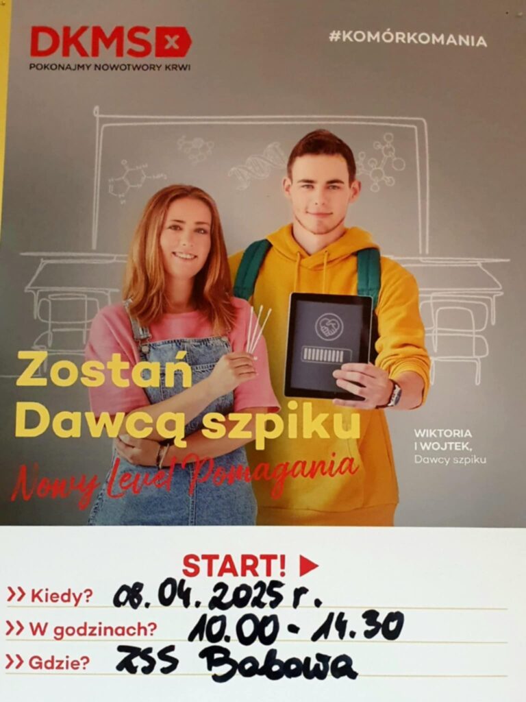 Wzruszająca chwila! W kwietniu 2025 roku w Zespole Szkół Zawodowych im. Stanisława Wyspiańskiego w Bobowej osiemnaście osób zarejestrowało się w bazie potencjalnych dawców szpiku, a to w ramach projektu „Komórkomania” prowadzonego przez Fundację DKMS. Już po kilku miesiącach okazało się, że jeden z uczniów znalazł bliźniaka genetycznego! To radość dla całej społeczności szkolnej.