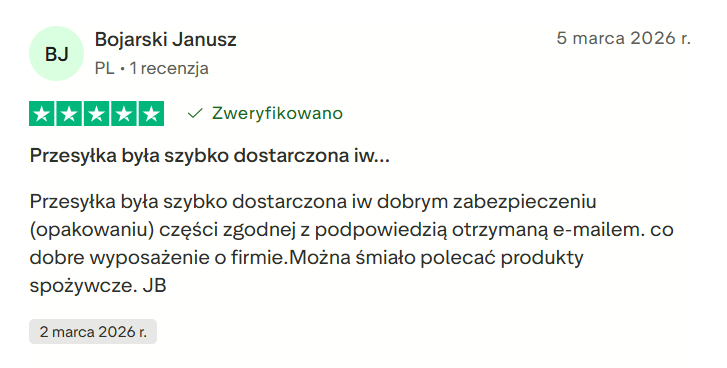 Jeden z klientów Bojarski Janusz opisuje swoje doświadczenie zwięźle: szybka dostawa, właściwe opakowanie, część zgodna z otrzymaną rekomendacją e-mail. To właśnie ten poziom przewidywalności odróżnia zakupy z dobrą logistyką od zakupów z nadzieją.