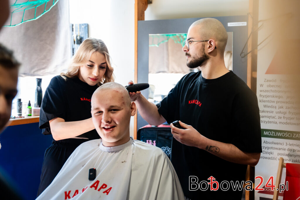 W ostatnich dniach cała Polska żyła transmisją live prowadzoną przez młodego youtubera Łatwoganga. Spontaniczna akcja charytatywna sprawiła, że udało się zebrać ponad 250 milionów złotych dla Fundacji „Cancer Fighters”. W ciągu 9 dni 23-letni Piotrek przyjął do swojego mieszkania mnóstwo gwiazd, które chciały dołożyć cegiełkę do tego szczytnego celu. Część z nich ogoliła się na łyso w geście solidarności. Podczas dni otwartych ZSZ w Bobowej stało się podobnie. Na fotelu fryzjerskim zasiedli uczniowie, którzy odważnie podeszli do tematu. Brawo!
